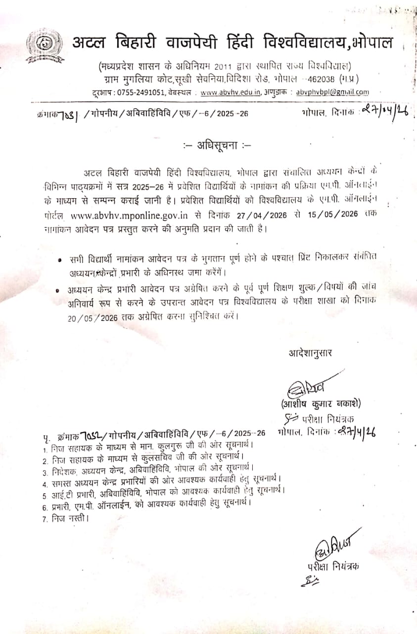 अटल बिहारी वाजपेयी हिंदी विश्वविद्यालय, भोपाल के वेबस्थल पर आपका हार्दिक अभिनंदन। ज्ञान-विज्ञान के सभी क्षेत्रों में शिक्षण, प्रशिक्षण एवं शोध को हिंदी माध्यम से बढ़ाने हेतु 19 दिसंबर, 2011 को मध्यप्रदेश शासन ने इस विश्वविद्यायल की स्थापना की है।
